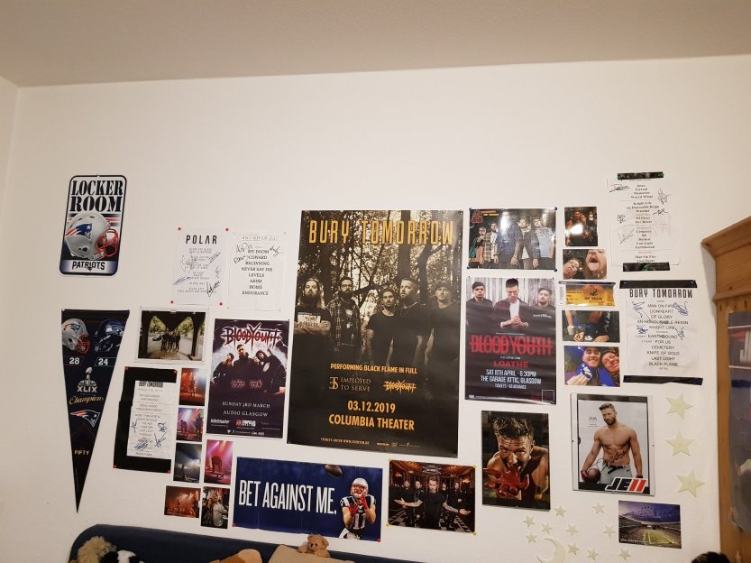 There are, even in lockdown modus and all, things I still greatly enjoy, things that give me something to hold on to in this trying time. Since the sports are obviously also cancelled until further notice, I am mostly favoring my lovely neighbors with some good music. Which consequently led to me re-decorating the wall next to my bed the other day.