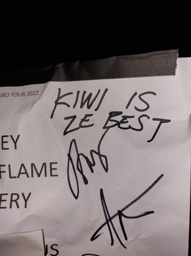Since we don’t do things half-assed here, I got a setlist, which is signed by almost everyone, and well, you see the KIWI IS ZE BEST scribbling? That’s from Dav whom I gave a very special gift to after the show. That alone already was worth the wait! I mean, I hadn’t seen them in almost three fucking years because of you-know-what, travel restrictions, no gigs whatsoever.